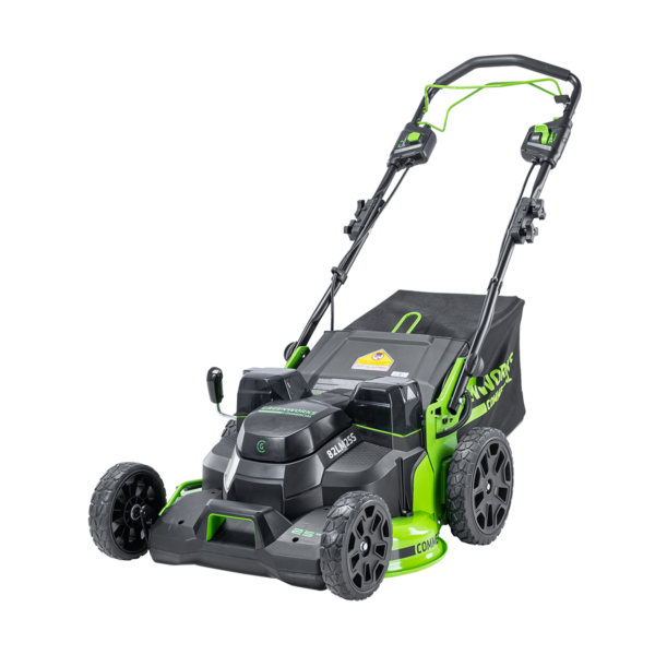 This mower features dual counter rotating mulching blades for the best quality cut which provide a 30% better cut quality and the large 25″ deck gives the user a 20% quicker cut time. Runtime is a sure thing, up to 90 minutes on a single charge, with the dual battery ports and the powerfully tough commercial grade motor will allow you to maneuver effortlessly, give you increased traction up hills and slopes and cut through the thickest challenges with ease. It also provides a higher lift for the best cut in any condition. The single lever height adjustment quickly raises or lowers the deck for different grass conditions with 7 positions for precise mowing and the handle adjusts for the users height and folds down for easy storage.