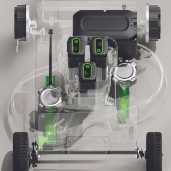 Designed for the commercial landscaper, the 82V 30″ lawnmower boasts an extra large grass bag that carries 12% more clippings than comparable units and has independently controlled wheels for optimised traction. It also includes a smart LCD screen that provides the status of the lawnmower (battery status, speed control, blade speed and error codes) and a tri-port powerhead that holds three batteries for continuous runtime.
