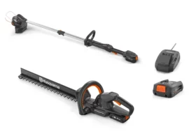 This bundle includes Husqvarna Aspire™ LC34-P4A Lawnmower and T28-P4A Grass Trimmer, along with a single 4.0Ah 18v battery and charger.