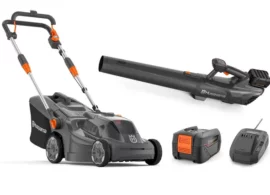 This bundle includes Husqvarna Aspire™ LC34-P4A Lawnmower and T28-P4A Grass Trimmer, along with a single 4.0Ah 18v battery and charger.